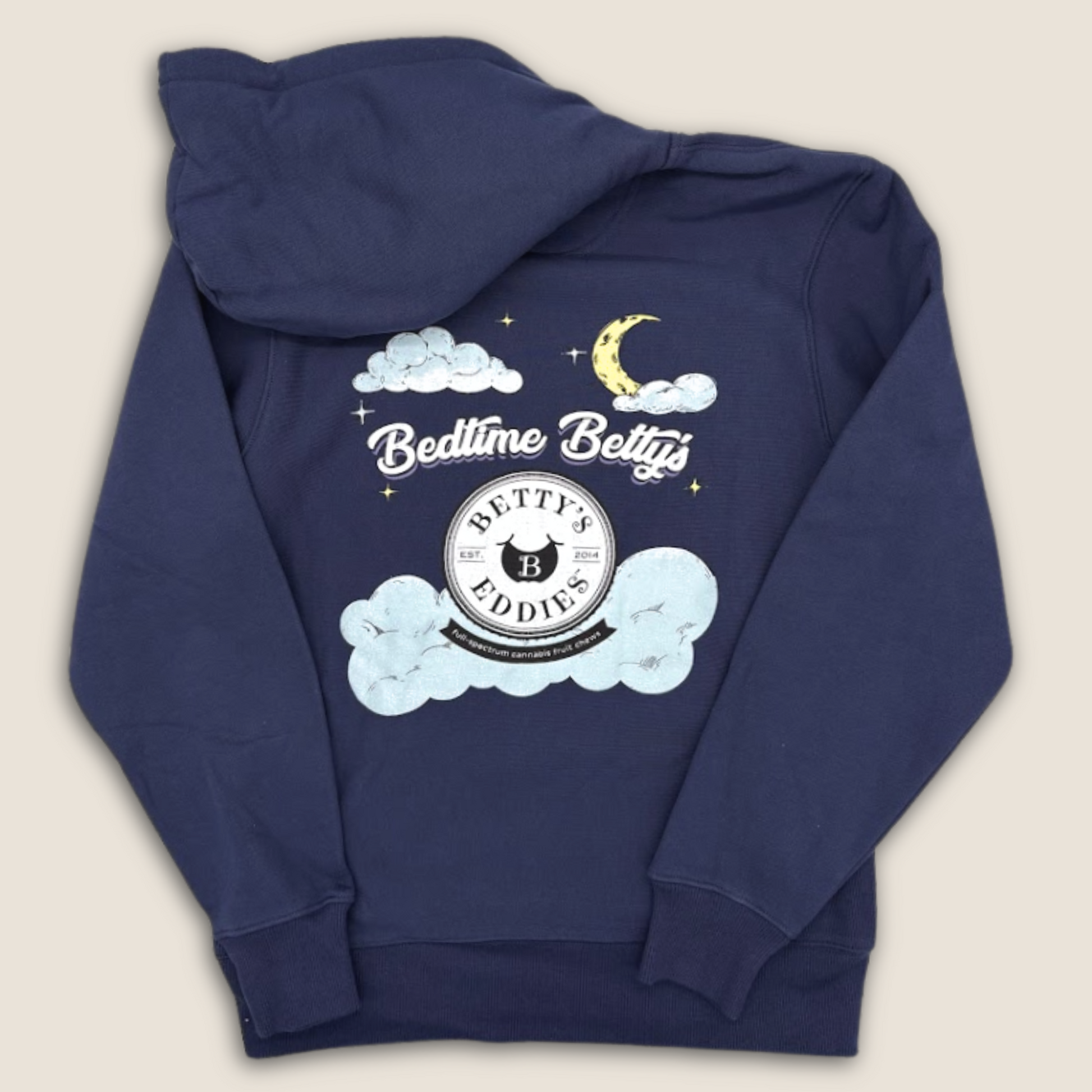 Sleep tight in our Bedtime Betty's Hoodie! This sweatshirt is made of 80% cotton/20% polyester and will keep you warm and stylish on chilly days and nights. Featuring a large, screen-printed Betty's Eddies seal on the front, and the same seal tucked into soft, pillowy clouds on the back, you'll be showing your Betty's love. Wide cuffs, hood, and a roomy front pocket. Sized with a relaxed, unisex fit.